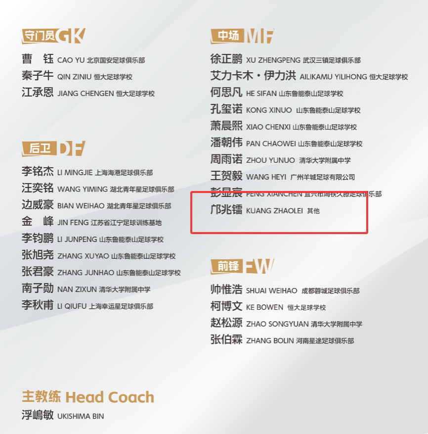 U17国足最新一期大名单,邝兆镭所属俱乐部显示为“其他”。而去年邝兆镭被征召的名单中,显示所属俱乐部是“莱里达竞技足球俱乐部”。