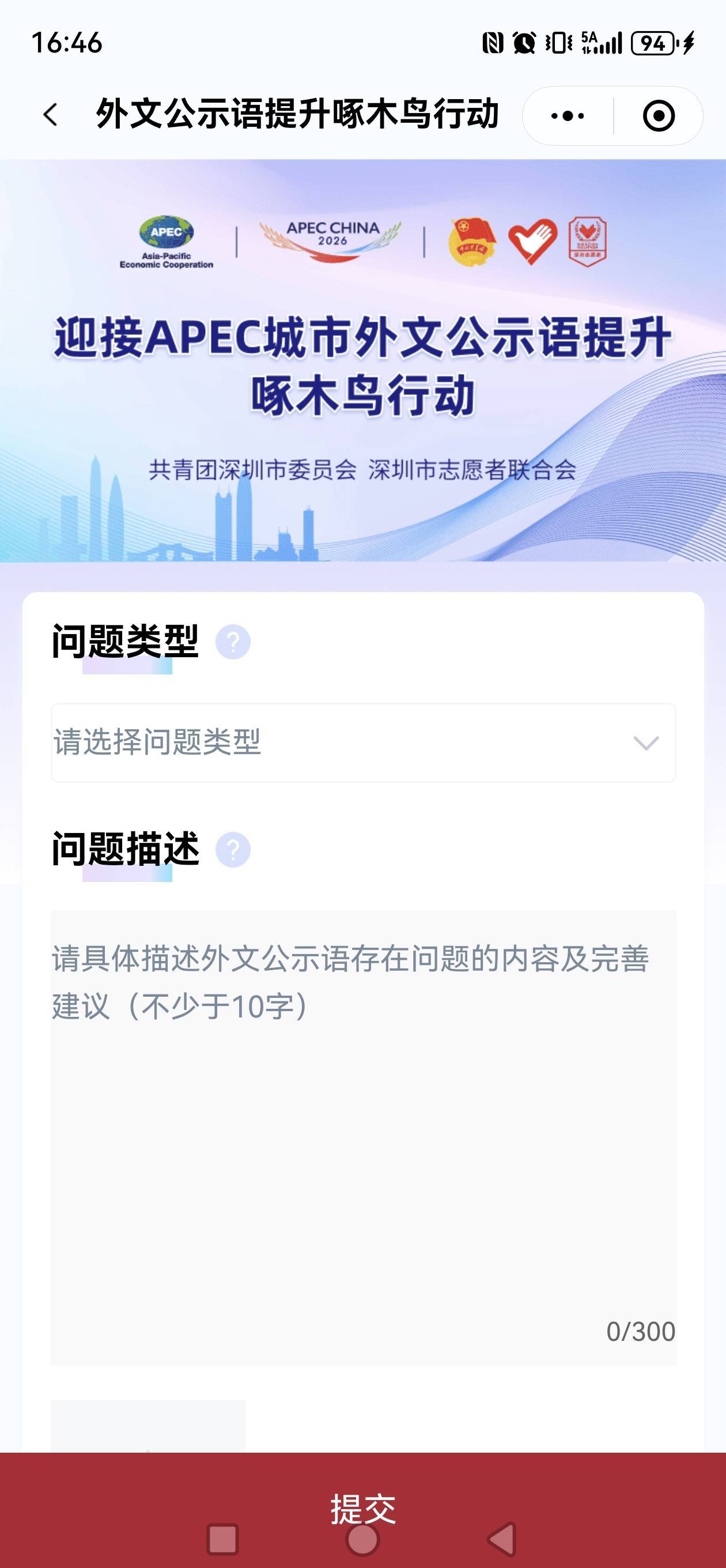 “啄木鸟行动”反馈界面。办好2026 APEC会议,既需要志愿者热情周到的服务,也离不开规范、友好、国际化的城市语言环境。每一处路牌、每一句指引,都是世界认识深圳的“第一眼”。为打磨城市国际化细节,团市委、市志愿者联合会发起城市外文公示语提升“啄木鸟行动”,面向全体市民与志愿者征集外文标识问题。市民可通过“志愿深圳”小程序进入反馈专区,对翻译错误、拼写语法问题、标牌遮挡破损、内容不对应等情况拍照上传,系统自动生成定位,并可一键跳转官方中英译写查询系统比对核验。活动号召志愿者聚焦口岸、交通枢纽、文旅地标、核心街区等重点区域,以“绣花功夫”提升城市语言环境。