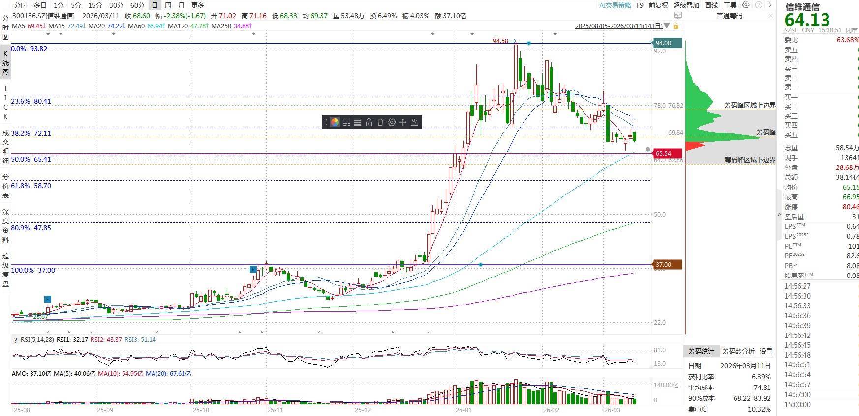 3月13日晚,SpaceX概念股、商业航天龙头信维通信(300136)发布重磅定增公告,拟定增募资不超60亿元,扣除发行费用后核心投向商业卫星通信器件及组件项目,配套布局射频器件及芯片导热散热器件项目。作为国内泛射频领域及商业航天赛道双龙头,公司此前凭借SpaceX概念加持、商业卫星订单落地,43个交易日股价便从28元,快速上涨至94元,实现翻三倍涨幅。而截至今日收盘,公司已然回调至64.13元,总市值达620.5亿元。此次60亿定增精准再加码商业卫星,能否突破估值瓶颈,跻身千亿市值阵营,成为当下A股核心看点。