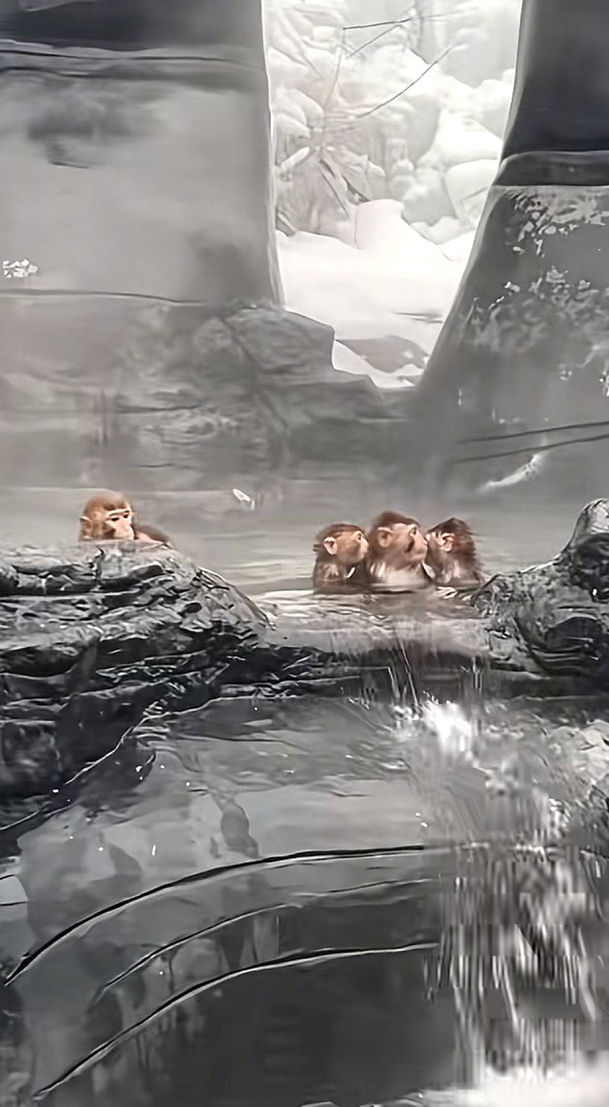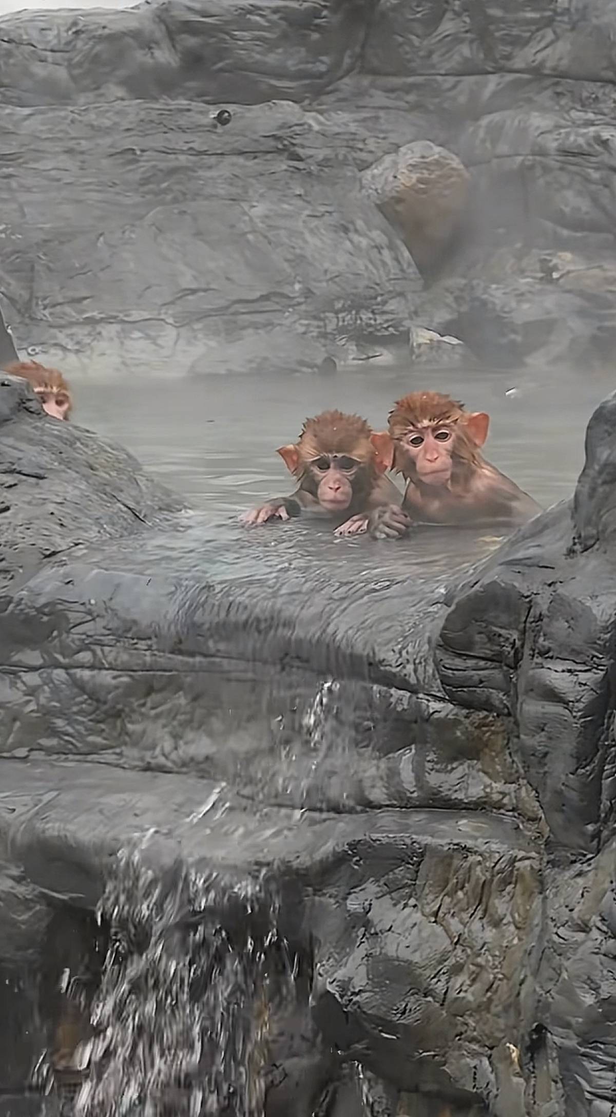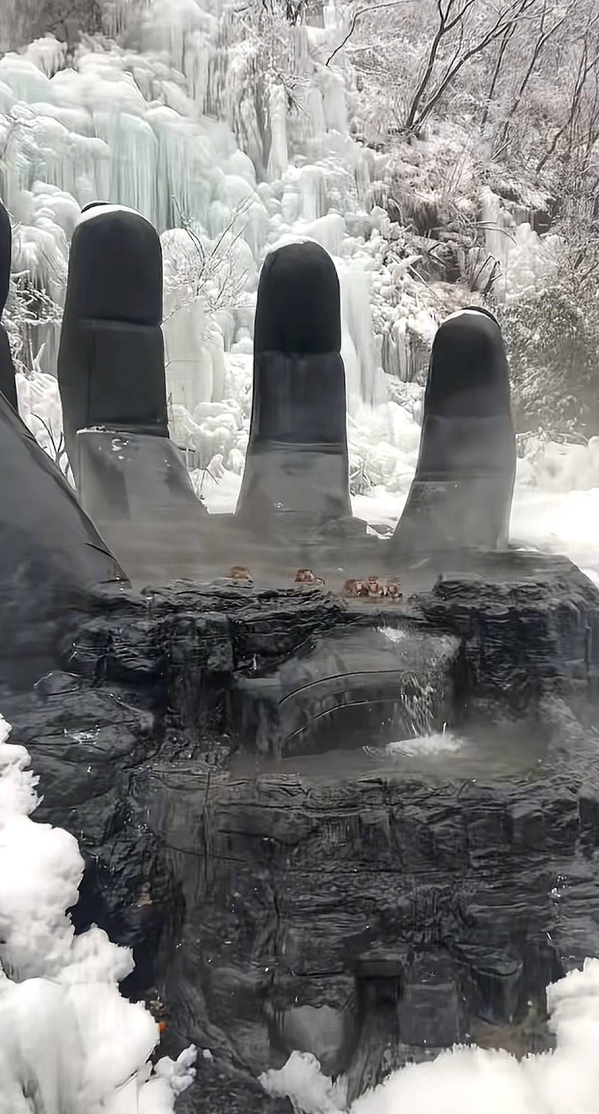 相比往年,今年的温泉也有升级。视频显示,该温泉的造型变为“五指山”,猕猴们时而跳跃到手指上,时而在水里抱团泡澡,非常快活。