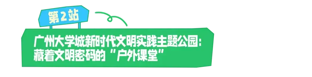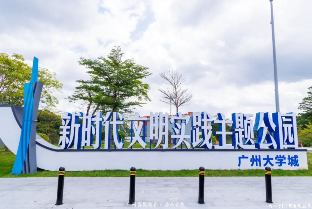 而中心湖畔的广州大学城新时代文明实践主题公园,绝对是课后“颜值+内涵”双在线的打卡地!入园先见蓝色主调入口标识:“人字形”书本底座呼应“以人为本”与育人初心,岭南屋檐叠着番禺记忆,像翻开一本“会呼吸的书”。