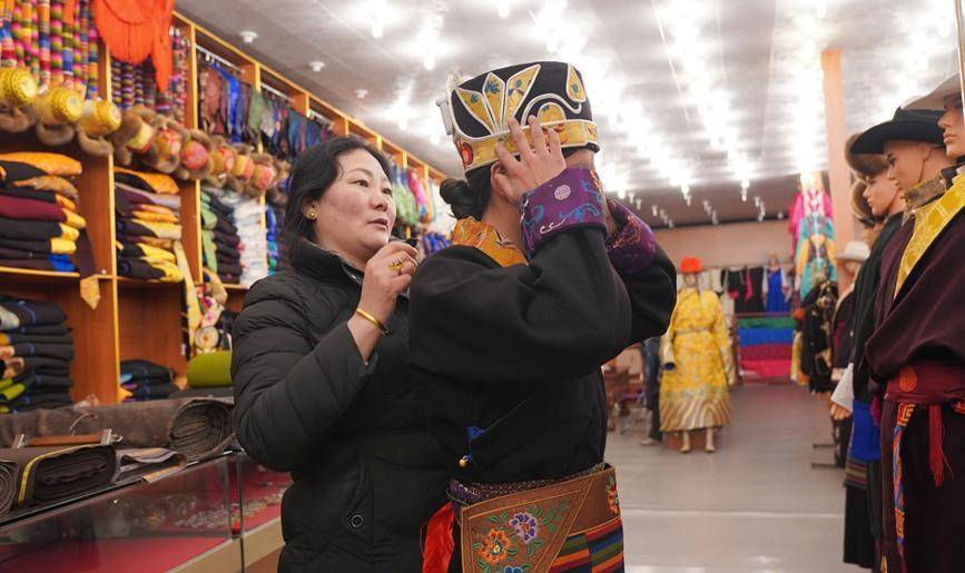 不远处的墨竹工卡县综木夏传统服饰有限公司内,各色藏装挂满货架,极具地方特色的“墨竹直孔朗霞帽”整齐陈列。店主贡觉曲珍正熟练地为顾客试穿新装。从2012年开店至今,她见证了藏装从“节庆特供”到“日常穿搭”的转变。“以前除了年前,平时几乎没生意。现在不一样了,随着县里发展,大家生活水平提高,平时结婚、办庆典、过节日都有人穿。这不仅是买件衣服,更是对本土文化的认同与自信。”